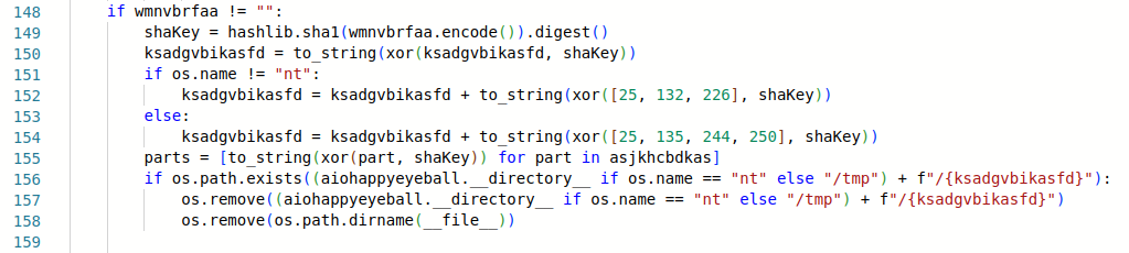Line 155 decrypts another previously defined variable, which is a one-element list. We get here the value “staggerd.pyc” – this is exactly the file stored in aiohappyeyeball. In lines 156-158 we see a tracks covering mechanism: if the decrypted extension module file exists, it will be removed, and the code will also attempt to delete the ZIP archive it’s loaded from. We can see the use of the strange __directory__ variable from the aiohappyeyeball: it’s a helper for the location of the malicious module on Windows.