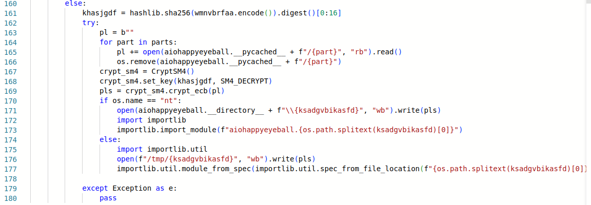 Once the key has been found, the code uses it to decrypt one of previously declared variables (line 150). The decrypted value is staggerd, what matches the file name of the PYC file from aiohappyeyeball. Lines 151-154 adds the file extension, .pyd on Windows and .so otherwise. These extensions are used for compiled native Python extension modules. The constructed name will later be used to store the final decrypted extension module.